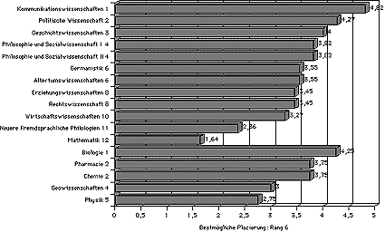Trotz der Ergänzung im Verfahren blieb das Ranking insgesamt ohne nennenswerte Veränderungen. Nur die Politologen konnten sich um einen Platz verbessern: dank der höchsten Drittmitteleinnahmen und der zweitbesten Publikationsquote r&uum l;ckten sie erstmals auf Platz zwei der Sozialwissenschaften vor und verwiesen die Geschichtswissenschaften auf Platz drei. Plus: 12.475 DM.