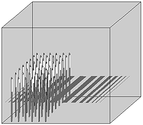 Statt Wellensalat ein wohldefiniertes elektomagnetisches Feld: Um die Auswirkungen elektrischer Felder auf lebende Organismen zu ergründen, setzen Biophysiker Zysten von Salzkrebschen in einem Hohlraumresonator einem elektrischen Feld aus, das nur eine einzige Frequenz (150MHz) hat. Zur Veranschaulichung der Feldstärken dienen die Balken in der Skizze: Je dicker desto stärker das Feld. Die Proben stehen in sechs Reihen a acht, so daß die Feldstärke von Reihe zu Reihe variiert. Die Experimente ergaben, daß sich z. B. die Schlupfrate der Zysten bei einer bestimmten Feldstärke um 10-15% verringert.