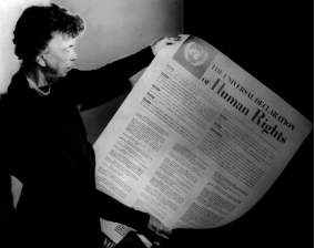Eleanor Roosevelt mit der Allgemeinen Erklärung der Menschenrechte. Sie war Vorsitzende der Menschenrechtskommission, die den Entwurf erarbeitete.