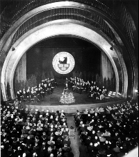 Am 4. Dezember 1948 - eine Gedenkplakette in der Fassade erinnert daran - fand in diesem Haus die Gründungsfeier der FU statt. Der Titania-Palast war damals Zentrum des kulturellen Lebens in West-Berlin. Nur wenige große Säle hatten den Krieg halbwegs unbeschadet überstanden. Hier spielten die Philharmoniker erstmals nach dem Krieg, hier gab es große Konzerte internationaler Stars, hier wurde Theater gespielt, hier fanden die ersten Berliner Filmfestspiele statt und hier wurde eben auch eine Universität gegründet - mitten während der Blockade Berlins.