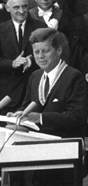 Der Onkel: John F. 1963 an der FU.John F. Kennedy besuchte am 26. Juni 1963 Berlin. Vor dem Rathaus Schöneberg sprach er die legendären Worte "Ich bin ein Berliner!" Im Anschluß, nachmittags gegen 15.30 Uhr, verlieh ihm die Freie Universität durch ihren Rektor Ernst Heinitz bei einem Festakt vor dem Henry-Ford-Bau die Ehrenbürgerwürde der FU. Dabei sprach Kennedy über die gesellschaftliche Verantwortung von Gelehrten und Gebildeten für die Verwirklichung von jenen Werten, Wahrheit, Gerechtigkeit und Freiheit , denen sich auch die Freie Universität verschrieben hat, wie ihr Wappen kundtut.