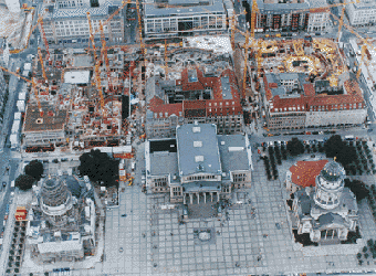 Bau auf, bau auf... Die Galerie Lafayette steht mittlerweile in der Friedrichstraße, wo hier noch die Baugrube zu sehen ist, vorn im Bild der GendarmenmarktNein, alleinige Hauptstadt soll Berlin vorerst nicht sein. Und eine metropolitane, gar zentralistische Hauptstadt, wie sie für fast alle europäischen Staaten charakteristisch ist, soll Berlin nicht werden. Gewiß scheint also, was die neue Hauptstadt weder werden darf noch werden kann.