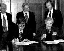 In Kim, Präsident der Berliner Samsung Elektronische Bauelemente GmbH, und FU-Präsident Johann W. Gerlach unterzeichneten einen Kooperationsvertrag, der den Austausch von deutschen und koreanischen Studierenden fördert. Die Zusammenarbeit kam auf Initiative von Prof. Sung-jo Park zustande (im Bild hinten links). Er lehrt am Ostasiatischen Seminar der FU. Rechts neben ihm: die Vizepräsidenten Günter Kaindl und Werner Väth.