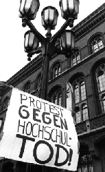 Hurra, wir leben noch! Transparente vor dem Roten Rathaus erinnern Politiker an ihre Verantwortung für die Wissenschaft.Die Welle der öffentlichen Sympathie, von der die Aktionen getragen wurden, riß so auch viele zunächst noch zögernde Dozenten mit ins Freie. Wie hätten sie sich auch diesem neuen "Wir haben keine Chance, aber die nutzen wir"-Gefühl entziehen können? Statt verkrampfter Mienen, entwaffnendes Lachen, statt weltfernes Klassenkampfkau-derwelsch, unprätentiöse Bestandsaufnahme des politischen Desasters, statt geballter Faust zum sozialistischen Gruß, Radeln für Radunski und Flitzen für die Uni: Die Studierendengeneration von heute kämpft nicht für die Weltrevolution - wie einst ihre Eltern - aber sie kämpft auch nicht nur isoliert für ihre eigenen Interessen, sondern gegen den Sozialabbau im reichsten Staat Europas. Und sie hat begriffen, daß der bornierte Grundsatz früherer Unistreiks, schlechte Presse sei immer noch besser als gar keine, heute angesichts allgemeiner dramatischer Sparmaßnahmen nur noch ein Spiel mit dem Feuer wäre, das sie selbst erfassen könnte.