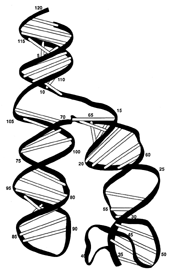 Modell eines RNA-Moleküls aus Kolibakterien. Links ist das Molekül schematisch dargestellt, auf der rechten Seite läßt sich die angenommene räumliche Struktur nachvollziehen. Die Symbole A, C, G und U stehen für die vier verschiedenen RNA-Bausteine (Nukleotide) Adeninphosphat, Cytidinphosphat, Guanosinphosphat und Uridinphosphat. Dieses Molekül besteht aus 120 Bausteinen. Wesentlich komplexer ist dagegen die H 19 RNA, die Prof. Erdmanns Gruppe erforscht: Sie besteht aus 2300 Bausteinen.Für die RNA-Arbeitsgruppe von Professor Erdmann wurde die Krebserkrankung interessant, als die israelischen Wissenschaftler herausfanden, daß ein bestimmtes RNA-Molekül dabei eine wichtige Rolle zu spielen scheint. Diese sogenannte H19 RNA findet man normalerweise nur in embryonalem Gewebe und in der Plazenta, also dort, wo sich Zellen sehr schnell vermehren müssen. Bei den Tumoren taucht sie allerdings überraschenderweise auch auf - und zwar in den äußeren Zellschichten. Hier verdrängt das Tumorgewebe durch sein starkes Wachstum das gesunde Gewebe des Körpers. Die genaue Rolle, die das RNA-Molekül bei diesem Prozeß spielt, ist noch unbekannt, zumindest ist aber sicher, daß es nicht zu einer einfachen Informationsübertragung von einem Gen zu einem Protein dient. Es handelt sich bei der H19 RNA also um eine der eingangs erwähnten neuen Mitspielerinnen auf der biochemischen Bühne und die Umstände legen es nahe, daß sie gerade bei der Geschichte mit dem Blasenkrebs eine tragende Rolle spielt.