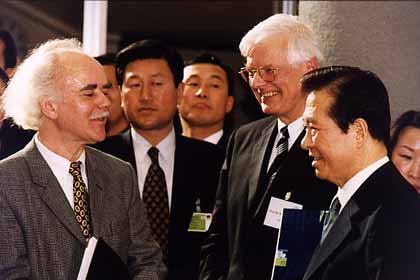 BZ: Der Staatspräsident der Republik Korea, Dr. Kim Dae-jung (rechts) im Gespräch mit FU-Präsident Prof. Dr. Peter Gaehtgens und Prof. Dr. Ralf Ryltewski (links) Foto: Dahl | ||||||