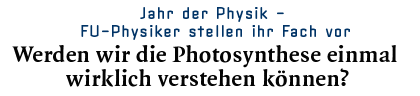 Zum Verständnis der Photosynthese werden von den biophysikalisch arbeitenden Gruppen unseres Fachbereichs in den als für diesen Prozess wichtig erkannten Farbstoff-Proteinkomplexen die nach Lichteinfall ausgelösten Änderungen der geometrischen und magnetischen Struktur und dadurch gestartete Transportvorgänge studiert. Zum Einsatz kommen dabei die modernen zeitaufgelösten Methoden der Optischen Spektroskopie und der Magnetischen Resonanz. So ist z. B. die Form der elektrischen Potenzialbarriere von Ionenkanälen in Zellmembranen und ihre Steuerung durch Zusätze und die genannten Strukturänderungen weltweit Gegenstand intensiver interdisziplinärer Forschung, da Transportprozesse durch Zellmembranen eine übergeordnete Rolle in Biologie und Medizin spielen. Die Ergebnisse derart grundlegender Experimente sind für das Verständnis verwickelter biophysikalischer Prozesse unerlässlich. Dabei lassen sich spezifische Aussagen nur dadurch gewinnen, dass neben den'Wildtypen' auch Mutanten der Proteine gezielt hergestellt werden. Diese Arbeiten werden von der Deutschen Forschungsgemeinschaft nachhaltig gefördert.