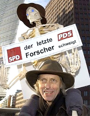 Ihn kennt inzwischen jeder. Den braunen Damenhut auf dem Kopf, Knieschoner am Bein und unvergleichlich blau funkelnde Augen. Unser Knochenmann ist inzwischen Demo-Veteran mit Medienerfahrung, erzählt Dr. Georg Bergmann, Ingenieur im Biomechanik-Labor der Freien Universität Berlin, und fährt fort, dass das Skelett schon mehr Demonstrationserfahrung habe als mancher anderer. Jahrelang stand das Oskar-Helene-Heim auf der Abschussliste, wo das hoch-spezialisierte Biomechanik-Labor der Gruppe Bergmann bis zur Schließung angesiedelt war. Damals kam der eingespielten Gruppe die Idee, mit einem Skelett auf die drohende Abwicklung dieser bekannten orthopädischen Klinik hinzuweisen. Genutzt hat es nichts. Umso mehr wollen die Biomechaniker gegen die nun drohende Schließung des Fachbereichs Humanmedizin am Universitätsklinikum Benjamin Franklin demonstrieren. Vier Mal in der vergangenen Woche hat sich Dr. Friedmar Graichen schon das Skelett auf den Rücken gebunden, während Bergmann und der Dritte im Bunde, Dr. Antonius Rohlmann, ihre Meinung mit Plakaten kund taten.
