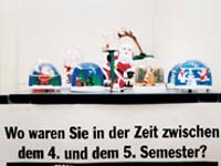 Wolfgang Röckes Schneekugelwelten lassen das Eis schnell schmelzen |  Atmosphäre muss stimmenWichtig ist vor allem, dass die Atmosphäre im Arbeitsraum stimmt, meint Prof. Erika Fischer-Lichte, Dozentin für Theaterwissenschaft an der FU, das ist wie beim Theater. Schon wenn man das Bühnenbild sieht, erfährt man viel über die Stimmung, die Situation, von der das Stück ausgeht. Die schlichte Eleganz ihres zweiteiligen Zimmers beherbergt eine ganz besondere Rarität: den überlegen grinsenden Gustav Gründgens in der Rolle des Wallenstein  als Kleiderständer und in Originalgröße. Atmosphäre, die dichter nicht sein könnte, herrschte bis vor wenigen Monaten auch in der Poststelle des Präsidialamts in der Kaiserswerther Straße. Alpenpanoramen in Öl über Plüschsofas standen dort in hartem Kontrast zur funktionalen Nüchternheit von Stempelkissen und Frankiermaschinen. Damit ist Schluss, seit die Postmoderne Einzug auch in diesen Servicebereich gehalten hat. Ein paar Türen weiter spürt man sie aber noch, die FU-Gemütlichkeit der Vorwendezeit: Fast so alt wie die Universität selbst ist der immer noch funktionstüchtige Wasserkocher in der Vervielfältigungsstelle, der unter dem Puzzelfoto eines Hopi-Indianers leise vor sich hin röchelt. Der Hightech-Kopierer gegenüber stört dort fast die Idylle. Es zeigt sich: Jede Einrichtung hat ihre Psychologie und viele Ausstattungsgegenstände ihre eigene Geschichte. Da ist zum Beispiel jene, die aus dem Präsidialamt der FU stammt: Da verbirgt einer seit Jahren die Batikbilder der Ehefrau hinter dem Schrank, anstatt sie selbstbewusst im Büro aufzuhängen. Warum? Ganz einfach: Er will nicht mit ihnen identifiziert werden. Denn, so expliziert Prof. Dr. Ernst-H. Hoff, Arbeitspsychologe an der FU, wir bringen uns nicht nur als Berufsperson in die Arbeit ein, sondern stellen uns über Bilder und persönliche Dinge als eine ganzheitliche Person dar. Aber was ist mit denen, die die persönlichen Dinge mitbringen, sie aber nicht zeigen?, fragt sich der Laie und wundert sich.