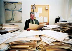 Aber es geht auch anders: Bei Prof. Alfred Kuß am Institut für Marketing beispielsweise drängt sich der Gedanke auf, dass hier ökonomische Rationalität zum dominierenden Gestaltungsprinzip erhoben wurde: ein schräg in den Raum gebauter Arbeitstisch, Regale, eine Magnettafel für Anträge und Notizen, freie Wände, tadellose Ordnung. Zum Fragen bleibt wenig Zeit, ungefähr fünf Minuten. Und doch gibt es etwas ganz Persönliches zu entdecken: Kuß trinkt seinen Kaffee aus einer Tasse, auf der ein Scherenschnitt von Richard Wagner abgebildet ist. Er ist leidenschaftlicher Wagner-Fan. Apropos Musik: Sie versetzt uns in Wallung, macht uns agil, bei Arbeit, Sport und Spiel, aber an deutschen Arbeits-plätzen  vor allem im öffentlichen Dienst  ist sie verpönt. Warum eigentlich? Längst ist wissenschaftlich erwiesen, dass Kühe mehr Milch geben und Hühner mehr Eier legen, wenn sie angenehm beschallt werden. Warum sollte das  im übertragenen Sinne  nicht auch für den Menschen, ja auch für den homo academicus, gelten? Einer, der es wissen muss, hat daraus für sich selbst längst Konsequenzen gezogen: Wenn der Zoologe Prof. Klaus Hausmann über seinen hawaiischen Pantoffeltierchen brütet, lässt er sich von leiser Orgelmusik inspirieren. Und davon hat er eine ganz Menge: Das CD-Regal nimmt in seinem Büro fast eine ganze Wand ein. Da bleibt neben dem Standardmobiliar wenig Platz für Fachspezifisches. Ein altes Mikroskop und das erbärmliche Skelett einer Hauskatze gehören dazu. Die steht nur da, weil sie in den Müll sollte, erklärt Hausmann fast entschuldigend und präsentiert eilig ein unscheinbares, aber für ihn sehr wichtiges Erinnerungsstück: das mehrere Kilo schwere Drahtseilende von einer Tiefsee-Expedition.