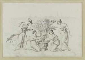 Pflege eines weißen Rosenstockes durch allegorische Gestalten, im Hintergrund die Silhouette von Berlin.