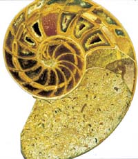Das aufgeschnittene, fossile Gehäuse eines Nautilus lässt die Kammerung erkennen, die das schon vor ca. 500 Millionen Jahren von den Kopffüßern entwickelte und bis heute angewandte U-Boot-Prinzip der Gleichgewichtshaltung durch das Fluten bzw. Abpumpen von Wasser ermöglicht.