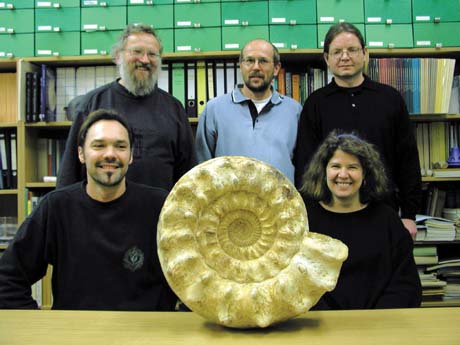 Was ist nun genau das Arbeitsfeld der AG Keupp? Der Doktorand Dirk Fuchs beschäftigt sich im Rahmen des gemeinsam mit Biologen und Paläontologen der Humboldt-Universität durchgeführten Graduiertenkollegs Evolutive Transformationen und Faunenschnitte mit fossilen Coleoiden. Coleoiden sind Tintenfische, die ihre Schale im Laufe der Evolution in den Körper hinein verlagert haben und diese Schale teilweise oder ganz reduzierten. Bei fast allen rezenten Cephalopoden wie Sepia, Kalmar, Krake und Co. handelt es sich um moderne Coleoiden. Dirk Fuchs durchsucht die Literatur und weltweit auch Sammlungen von Naturkundemuseen nach Merkmalen an fossilen Coleoiden und bewertet diese. Er soll eine Merkmalshierarchie nach einem einheitlichen System erstellen, erklärt Keupp, herausfinden, wie die Stammesentwicklung dieser Gruppe abgelaufen, wie sie durch äußere Einflüsse wie das Absenken des Meeresspiegels beeinflusst worden sein könnte. Das gleiche Gebiet, nur bei den Ammoniten, ist bereits Thema der fast abgeschlossenden Doktorarbeit von Anton Sprey. Zeitliche Abfolge und morphologische Details helfen auch, heutige Verwandtschaftsbeziehungen zu klären, meint Keupp. Deshalb durften beide dabei nicht die lebenden Kopffüßer aus den Augen verlieren.