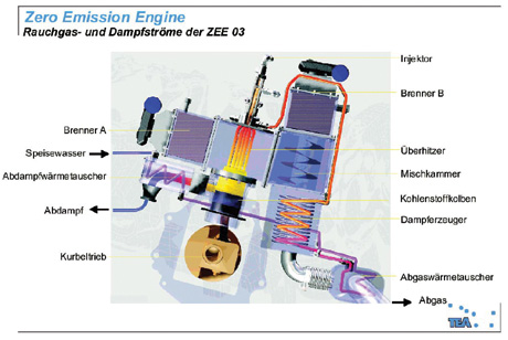Schematische Darstellung des Dampfmotors Zero Emission Engine.
