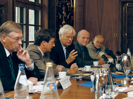 V.l.n.r.: Prof. Dr. Gerhard Ackermann, Präsident der Technischen Fachhochschule Berlin; Prof. Dr. Frank Eveslage, Vizepräsident der Humboldt-Universität zu Berlin; Prof. Dr. Peter Gaehtgens, Präsident der Freien Universität Berlin; Prof. Dr. Kurt Kutzler, Präsident der Technischen Universität Berlin, und Prof. Klaus Völker, Rektor der Hochschule für Schauspiel Ernst Busch" Berlin.