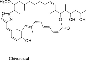Myxobakterien produzieren hochpotente Wirkstoffe gegen Pilze wie das Zytostatikum Chivosazol, hier als Formel dargestellt. Es gilt als das stärkste bisher bekannte Zytostatikum.