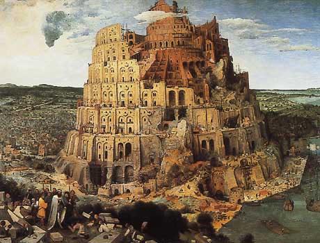 Und der Herr zerstreute sie von dort über die ganze Erde; und sie hörten auf, die Stadt zu bauen. Darum gab man ihr den Namen Babel, denn dort verwirrte der Herr die Sprache der ganzen Erde, und von dort zerstreute sie der Herr über die ganze Erde. (1. Buch Moses 11,1-9), Der Turmbau zu Babel, Gemälde von Pieter Breugel d.Ä., 1563