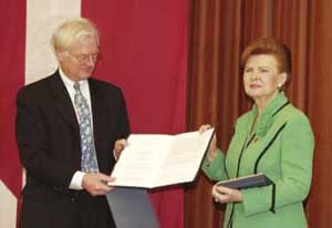 Die lettische Staatspräsidentin, H.E. Prof. Dr. Dr. h.c. mult. Vaira Vike-Freiberga, erhielt am 18. März auf Grund ihres herausragenden Engagements für die lettische Identität und ihr Mitwirken in leitenden Funktionen in führenden internationalen Wissenschaftsorganisationen die Ehrenmedaille der Freien Universität Berlin. Für ihre wissenschaftlichen Arbeiten hat Vaira Vike-Freiberga vier Ehrendoktorwürden, die große Medaille der Akademie der Wissenschaften Lettlands (1997) und den Marcel-Vincent-Preis der Französisch sprechenden kanadischen Wissenschaftler erhalten. Die viele Jahre an der Université de Montréal lehrende Psychologieprofessorin ist seit 1999 Präsidentin der Republik Lettland.