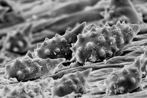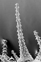 Mentzelia aspera Spitze eines Hakenhaares von der Frucht, mit der sie an Tieren haftet. Die rückwärts gerichteten Haken sind ca. 0,05 mm lang.