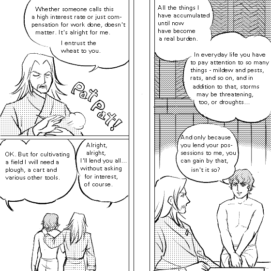In the beginning Robinson wanted to demand interest, but his intention failed. Now he even has a feeling of gratitude, when he lends his provisions out without taking interest. How come? |