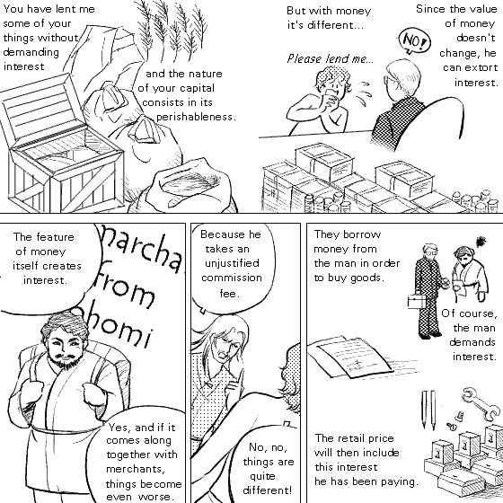 interest. Even when money gets stored, it doesn't lose its value. A merchant