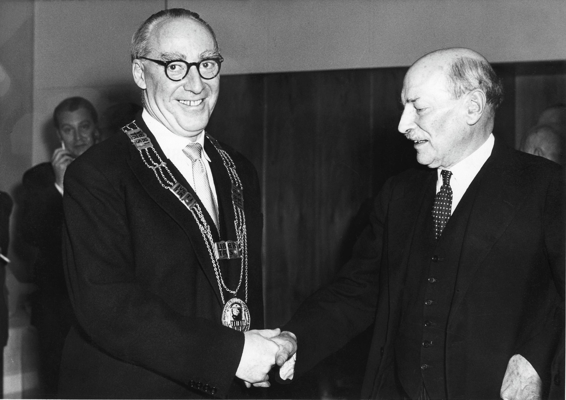 FU-Rektor Ernst Eduard Hirsch und Clement Attlee, Fotograf: Gerd-Victor Krau, © Deutsche Kinemathek – Museum für Film und Fernsehen, Quelle: Universitätsarchiv der FU, Foto/30364