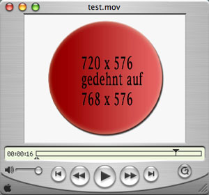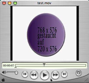 Das korrekte Vorgehen beim Umwandeln von mit Digitalkamera aufgenommenen Filmen in Webfilme oder CD-Rom-Filme wäre also dann ebenfalls das linke Vorgehen, aber danach müssen Sie Ihren kompletten Film entzerren (also z.B. von 720 x 576 auf 768 x 576 bzw. in der Regel auf ein viel kleineres 4x3 Format. Dies geht z.B. beim Reexport mit QuicktimePlayer Pro als Quicktime-, avi oder mp4-Film.