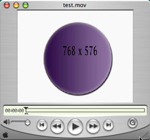 Obiger Kreis wurde auf einem weißen Hintergrund mit Größe 768 x 576 px gezeichnet. In iMovie importiert, erscheint er nach wie vor kreisrund (siehe oben), obwohl iMovie das Bild auf 720 x 576 px umgerechnet hat (PAL-DV-Größe). Bei DV-Export (unten) erscheint der Kreis auf Computerbildschirmen verzerrt (wegen der dort quadratischen Pixel), bei Darstellung auf einem TV-Monitor wäre der verzerrte Kreis aber wieder kreisrund. Dies war also das korrekte Vorgehen für iMovie bei DV-Produktionen. |