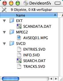 Nebenstehendes Beispiel ist mit der bereits beschriebenen DevideonDVD-Software von Formac erstellt. Ebenfalls ist alles auf CD gebrannt. Wenn Sie einen Player haben, der SVCDs abspielen kann, ist dies auch keine schlechte Sache. Sie sehen, dass die Struktur komplett anders ist, wir benötigen hier keinerlei Details. Ich möchte nur erreichen, dass Sie die Formate auch an ihren Strukturen unterscheiden können. |