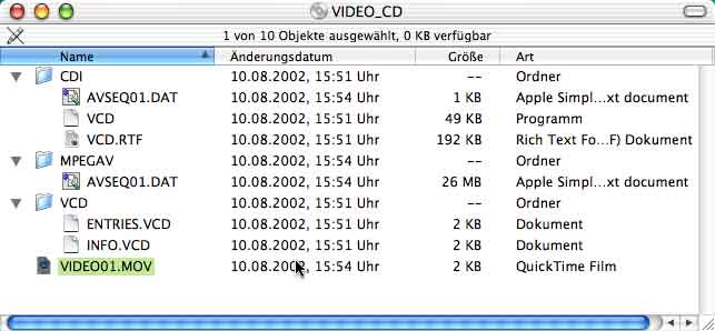 Diese qualitativ niedrige Lösung ist immer noch einigermaßen weit verbreitet. Sie hat wohl dadurch wieder Aufschwung bekommen, dass sie von manchen Brennern oder Schnittprogrammen sehr einfach und automatisch produzierbar ist. Nachfolgendes Beispiel wurde mit der Brennsoftware RoxioToast automatisch erstellt. Dazu muss man nur eine beliebige oder beliebige Filmdateien unter der Option VideoCD auf das Programmfenster ziehen, den Rest macht die Brennsoftware alleine. Folgende Struktur ergibt sich: