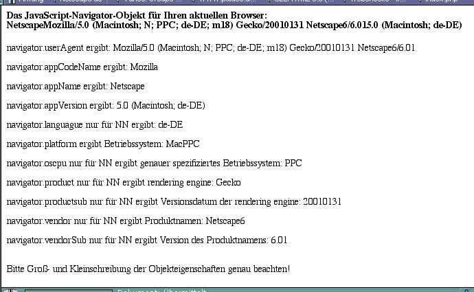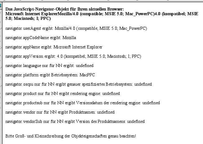 Oben wird der von Ihnen verwendete Browser auf alle Navigator-Eigenschaften ausgelesen. Unten finden Sie Screenshots dreier Browser. Verwenden Sie diese Angaben zur Erstellung Ihrer Browserweichen. Für unten nicht angeführte Browser rufen Sie diese Seite einfach mit einem entsprechenden Browser auf, Sie sehen dann die entsprechenden Angaben oben dargestellt. Undefined bedeutet, dass die Objekteigenschaft für den verwendeten Browser nicht unterstützt wird.