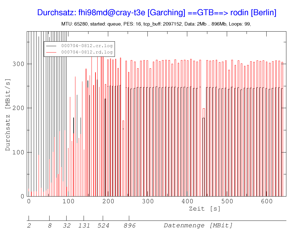 Weitere Tests der Verbindung zwischen Visualisierungs-Workstation Berlin (VWB, Computername "rodin") und numerischem Großrechner (Cray T3E, Computername "pc") sowie Verbindungen zum und vom Konrad-Zuse-Institut Berlin wurden von M. Schünemann (ZIB) im Rahmen des Projektes Meta (Metacomputing durch Kopplung von Hochleistungsrechnern, URL siehe Referenzen) mit dem Programm netperf durchgeführt.