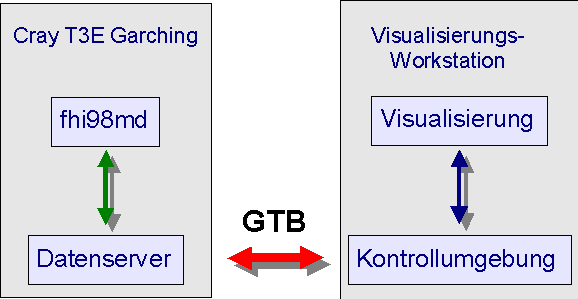 Das Programm für die Elektronenstrukturberechnung (fhi98md) ist ein Fortran90-Programm, das auf einer massiv-parallelen distributed-memory-Maschine läuft. Es muss während des Programmlaufs eine Steuerungsmöglichkeit bestehen, um auszuwählen, welche Daten zur Visualisierung übermittelt werden sollen. Dazu läuft ein separater Prozess (Datenserver) auf der Cray T3E, der das Konvertieren und Versenden der Ausgabedaten im gewünschten Format sowie das Empfangen und die Weitergabe möglicher Steuersignale während des Programmlaufs von fhi98md übernehmen kann (siehe Abschnitt II.4.3 "Datenserver und Kommunikationsprotokoll").