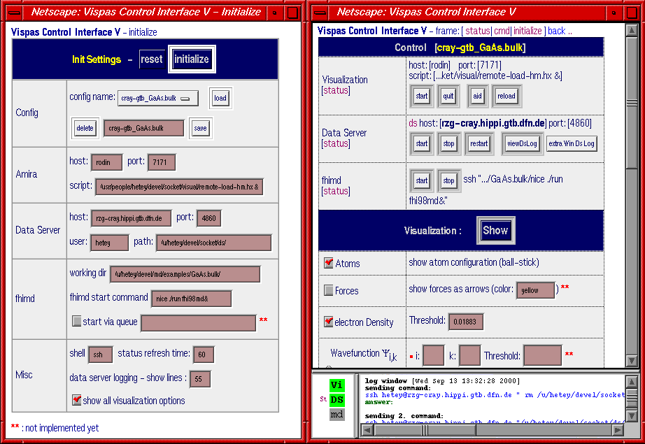 Es wurde eine Möglichkeit vorgesehen, die zu einem Projekt gehörenden Einstellungen unter einem Projektnamen zu speichern, um so einfach an verschiedenen Problemstellungen arbeiten zu können. Vom Control-Interface ist es nun möglich, das Programm fhimd per Knopfdruck zu starten oder zu beenden. Während der Rechnung kann man manuell die aktuelle Elektronendichte und Atomkonfiguration abfragen und visualisieren, sofern sie vom fhimd-Programm schon berechnet wurden. Dazu wird eine Anfrage an den Daten-Server geschickt (siehe ZB-0003, Abschnitt Datenkommunikation), der die Elektronendichte bzw. die Atomkonfiguration in das gewünschte Format konvertiert und zurückschickt, wo sie dann der Visualisierung zur Darstellung übergeben wird (siehe Abbildung 2).