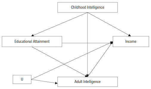 | Wahrer kausaler Prozess | Zusammenhang zwischen uV und uV ohne Kontrolle | Zusammenhang zwischen uV und aV bei Kontrolle der mittleren Variable |