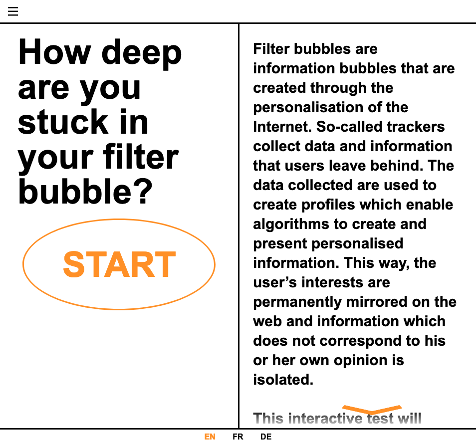 Auf dieser Webseite könnt ihr testen, wie tief ihr euch in der Filterblase befindet. Diese Seite gibt auch einige Anregungen, um die Blase platzen zu lassen.