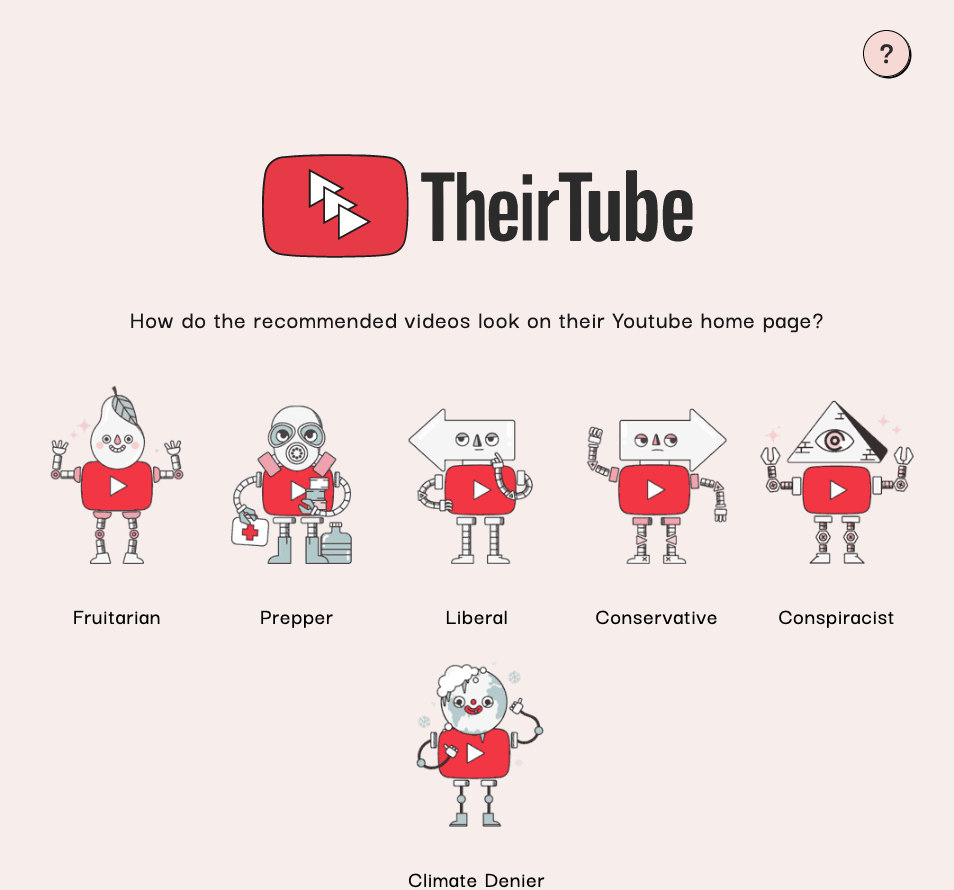 Schaut euch die Webseite TheirTube an und erfährt, wie es in der Filterblase anderer Nutzer und Nutzerinnen aussieht. Dabei stehen sechs Personas (also Internetpersönlichkeiten) zur Auswahl, dessen YouTube-Seiten sich unterscheiden.