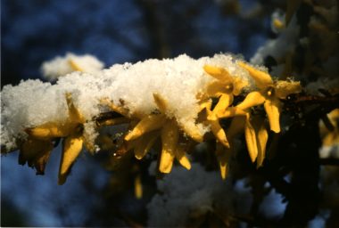 Im Frühling gibt es einen häufigen Wechsel von warmen Tagen, die die ersten Blüten (hier der Forsythie) hervorlocken, die aber auch vom Schnee bedeckt werden können.