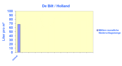 Der jährliche Gang des Niederschlags ist in De Bilt bereits kontinental bestimmt, was die Menge betrifft: Die höchsten Werte treten im Sommer (August) mit 88 l/m² auf, sind damit aber viel geringer als im irischen maritimen Klima während fast des gesamten Jahres.
