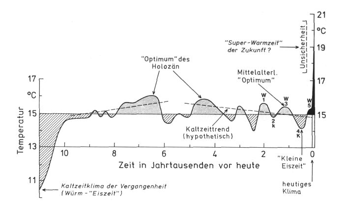 Die Variationen der bodennahen nordhemisphärischen Mitteltemperatur in den letzten 11.000 Jahren und Prognose für die nächsten 100 Jahre.
